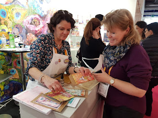 Auf dieser Händlermesse sind immer viele bekannte Künstler und Designer anzutreffen, die kleine Workshops oder Vorführungen abhalten. So habe ich z.B. auch Kate Crane getroffen, die für Carabelle designt und am Stand von GelliArts ihre neuesten Stempel und die Gelli Plate vorgeführt hat.